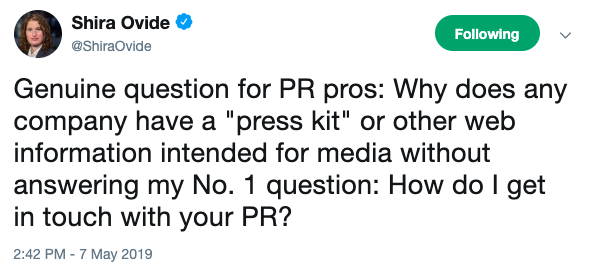 Most company sites rank highly for a branded search involving their company or product name. So if the reporter is already familiar with the business, and looking for a spokesperson, the goal is quickly helping them connect with someone to talk to.