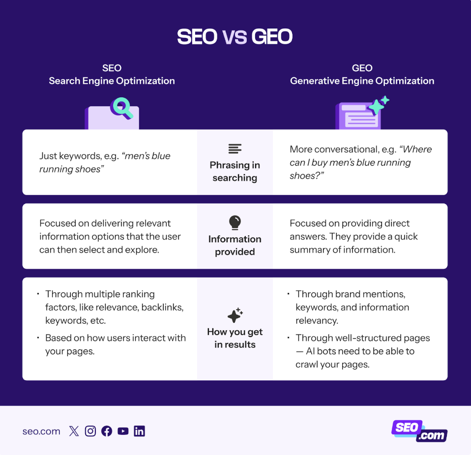 At a high level, SEO and GEO share the same goal: brand visibility. But the systems and the signals are fundamentally different. Traditional SEO is built for ranking within search engine results pages (SERPs). It optimizes content so crawlers can index it, algorithms can score it, and users can click it. Success is driven by factors such as keyword targeting, backlinks, page experience, and domain authority — all designed to secure a higher position in search results.