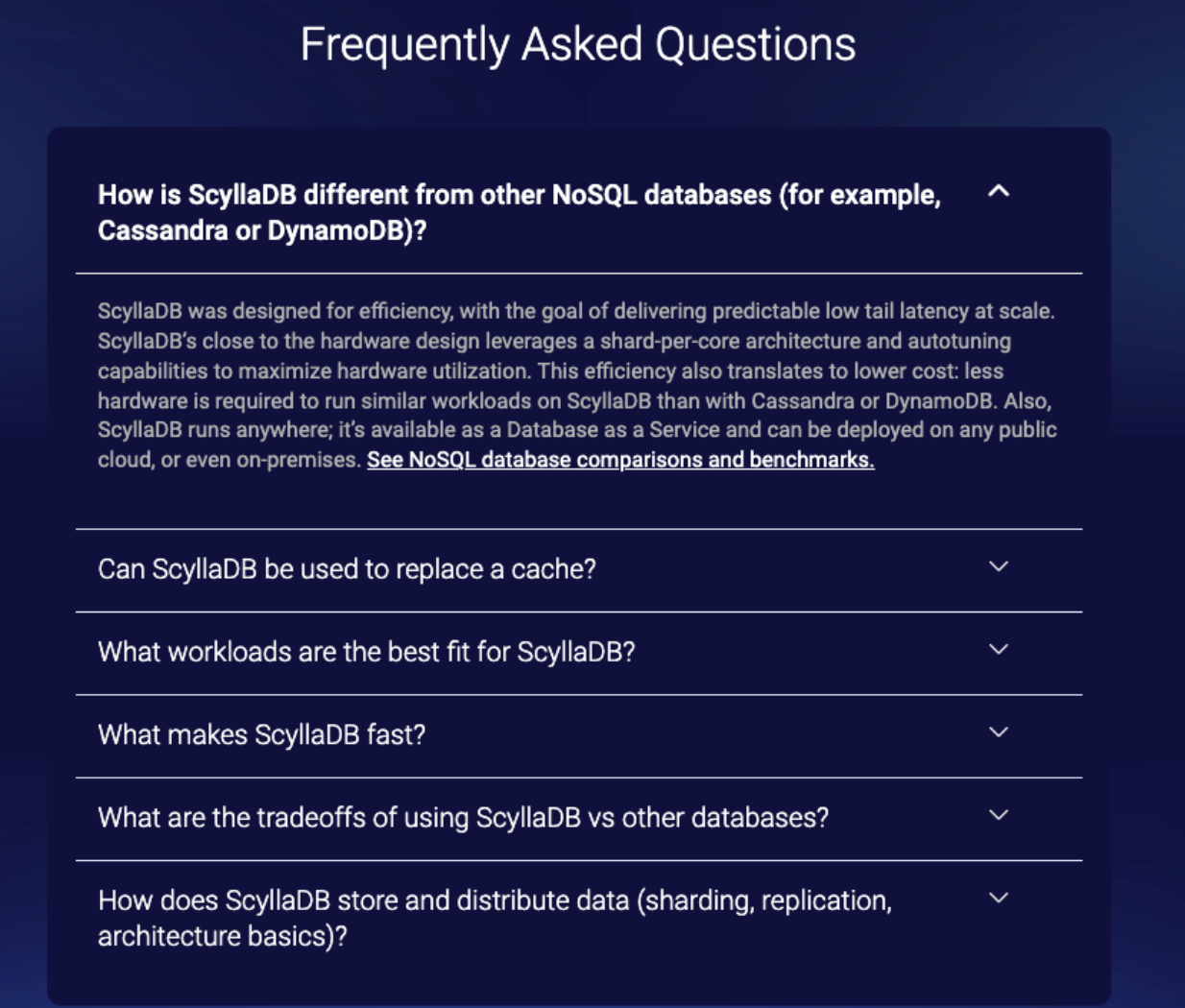 Here is an example of FAQs in practice with the ScyllaDB Product Overview page. This page, which was previously SEO-optimized, now has FAQ answers to common questions about the product, like how it differs from other NoSQL databases and what use cases it supports. Each question has a clear, direct answer, making it easy for both humans and AI systems to understand.