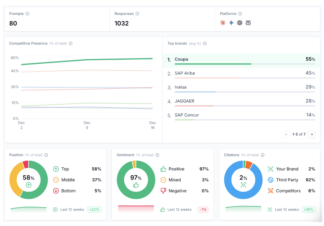It’s important to note that prompt-based reporting is synthetic — it simulates how AI systems could surface content based on model behavior and known queries, rather than capturing real-time usage inside proprietary LLMs. This means the results are directional, showing potential influence rather than definitive exposure.